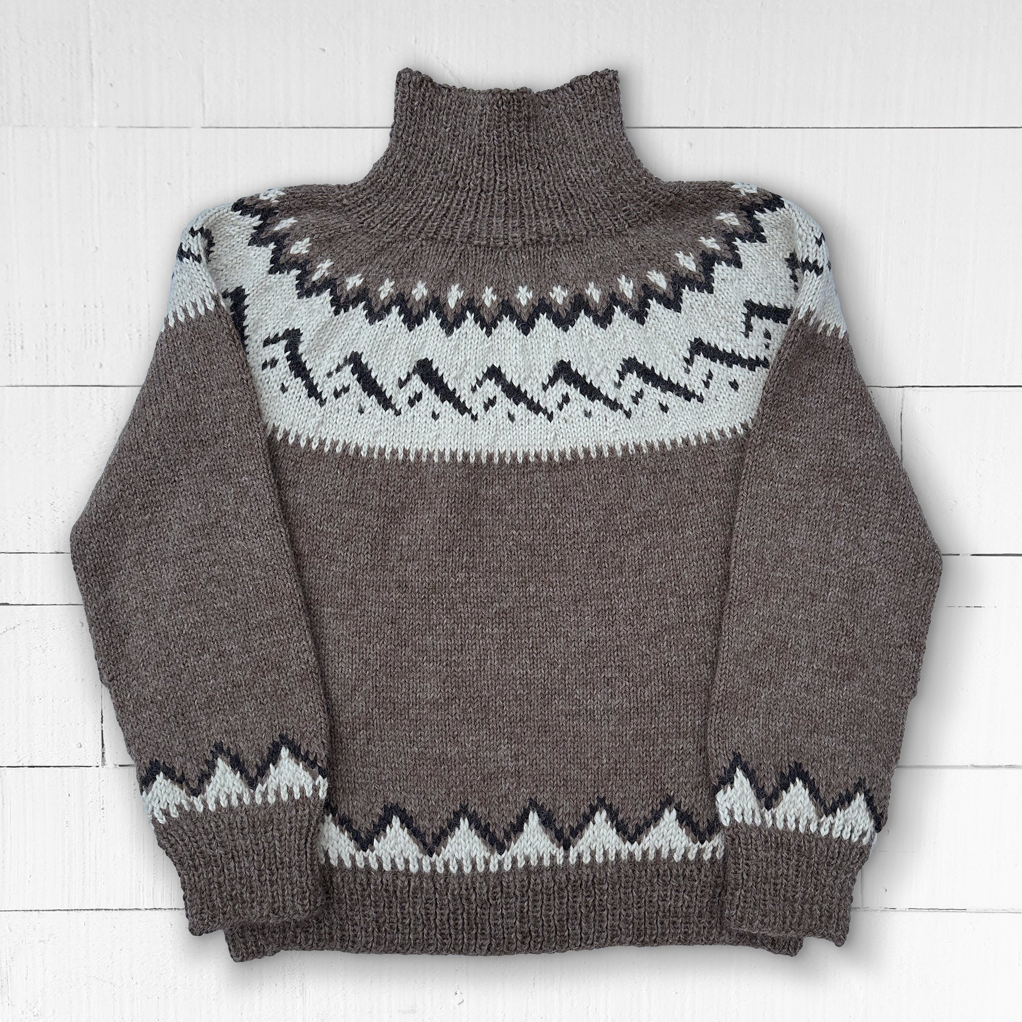 Inspired by traditional Scandinavian knitwear, the 3 pieces that make up our Nordic collection feature classic Fair Isle motifs around the yoke in warm, earthy natural tones. Hand-knitted in luxuriously soft, chunky baby alpaca yarn, this mountain motif version in soft fawny brown is exceptionally warm and weighty - the thickness of the yarn giving definition to the pattern and creating the feel of an authentically vintage piece.